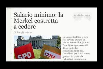 Così negli ultimi due giorni si è potuto leggere delle difficoltà della Merkel alle prese con la Grosse Koalition e con i socialdemocratici che, per starci, chiedono l’introduzione di un salario minimo orario. La notizia è riportata come se fosse una novità, ma invece era già un mese che si sapeva e almeno tre settimane che era stata ufficializzata dalla Spd. Forse non si voleva far sapere agli italiani che altrove sopravvivono malvagi “comunisti”, forse i giornali non se ne erano accorti avendo sguinzagliato i migliori inviati sulle tracce di Dudù, forse non si è ritenuta importante la notizia, convinti che si trattasse di solo di una mossa tattica come purtroppo avviene da noi. Fatto sta che il vostro cronista l’aveva riportata il 21 ottobre in questo post giudicandola importante per le eventuali ripercussioni anche sugli altri paesi europei, soprattutto in funzione antiprecarietà. E magari anche uno spunto politico per il nipote palle di acciaio e il suo rivale di partito, il sindaco testa di legno.