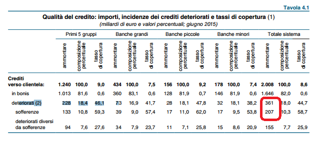 Ossia, che accanto alle sofferenze bancarie (207 miliardi di euro) ci sono anche gli altri crediti problematici, che sommati, appunto, alle sofferenze arrivano alla modica cifra di 361 miliardi di euro (dati Bankitalia al 30 giugno 2015)