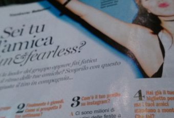 Innanzitutto perché dire fun & fearless, quando i corrispondenti in italiano di queste due parole esistono? Non sarebbe stato meglio “sei tu l’amica senza macchie e senza paura?” Certo che sì, ma, si sa, l’inglese a sproposito fa fyko e trendy. Notate anche la faccia da scema della tizia, e ha pure la bocca da papera. Quack.