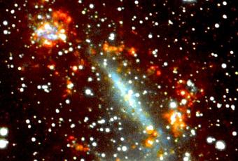 Immagine della collisione galattica ottenuta sottraendo l’immagine rossa da quella H-alfa, una operazione che permette di cancellare il contributo delle stelle normali mettendo in evidenza le regioni in cui è attiva la formazione stellare. Le immagini sono state riprese con il telescopio di 4m del Cerro-Tololo InterAmerican Observatory (CTIO) situato in Cile. Crediti: Quentin Parker / the scientific team