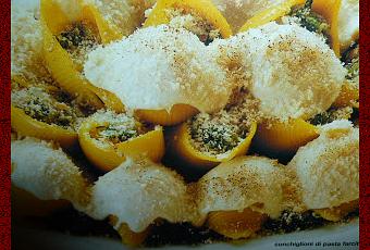 allargate gli spinaci stufati in una pirofila disponete i conchiglioni con la besciamella e il pangrattato