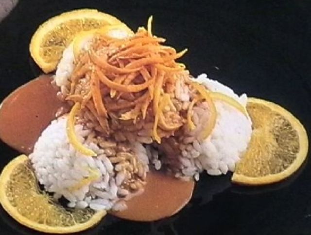 Mondate e tritate finemente una cipolla, quindi fatela appassire in una casseruola con tre cucchiaiate d’olio d’oliva. Aggiungete del riso e a fiamma vivace tostatelo per alcuni minuti ed infine sfumatelo con del vino bianco. Proseguite la cottura del riso aggiungendo di tanto in tanto del brodo bollente. Nel frattempo, per il condimento, riducete a filettini sottili la buccia di mezza arancia che sbollenterete in un pentolino con acqua e aceto. Mettete poi a riscaldare del sugo di arrosto, allungato con del marsala, del rum e il succo di mezza arancia. Lasciate sobbollire il sughetto e togliete dal fuoco il riso al dente. Servite disponendo nei piatti di portata il riso cosparso del condimento con sopra i filetti d’arancia adagiati a cascata. Bombardamento di Adrianopoli