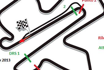Il primo punto di rilevamento è posizionato a 54 metri dopo la curva 12 mentre l’attivazione del DRS sarà possibile 104 metri dopo la curva 14. Per la seconda zona DRS, il punto di rilevamento è posizionato 16 metri dopo il vertice della curva 15 mentre l’attivazione del DRS sarà possibile 28 metri dopo la curva 15.