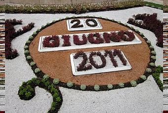 Il mosaico semi-floreale ci ricorda che oggi è il 20 di giugno 2011. Insieme a piccole aiuole contorna la fontana la cui costruzione risale al 1996 come scolpito nella pietra della fontana stessa.