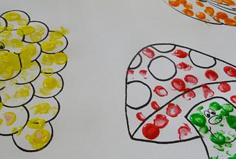 Come vi dicevo è molto semplice e potrete anche realizzarla con bambini più piccoli perché è molto intuitiva e si divertiranno un mondo, solitamente i timbri piacciono ai bambini. Basterà “pucciare” la gomma nel colore e timbrare all’interno del disegno, della sagoma o dello spazio che volete colorare. Più ne faranno e più la sagoma risulterà colorata in un modo particolare visto che i timbri verranno fatti tutti in maniera tonda, proprio come la gomma; quando dovete cambiare colore basterà pulire con un tovagliolo la gomma e potrete subito riutilizzarla “pucciandola” in un altro colore oppure, se avete più matite con la gomma sul retro, divertitevi ad usarne diverse; potrete anche colorare con fantasia e quindi mischiare fra loro i colori, ne verranno fuori delle tinte nuove e diverse e il disegno sarà ancor più personalizzato. Simone, con molta precisione, caratteristica che lo rappresenta, ha colorato una zucca, un fungo e un grappolo d’uva; fatelo anche voi e fateci vedere o fateci sapere cosa ne pensate di questa nuova tecnica.