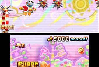 Il giocatore, a quel punto, deve gestire tre meccaniche contemporaneamente e individualmente: deve controllare Dedede, decidere l'elevazione dei salti per raccogliere le monete ed evitare nemici ed ostacoli, e battere il tamburo all'apice di ogni salto per accumulare punti. In un altro caso si sarebbe potuta trattare probabilmente di troppa carne al fuoco per un gioco tanto semplice, ma l'eccellente level design e il sistema di controllo precisissimo rendono l'esperienza tutt'altro che complessa anche nei momenti più frenetici, proponendo un livello di sfida sempre azzeccato e mai frustrante. Per esempio non basta più cadere nel vuoto o commettere un errore per fallire, e i cuori sono stati sostituiti da un indicatore che si consuma pian piano ad ogni sbaglio, rimandandoci direttamente al checkpoint più vicino.