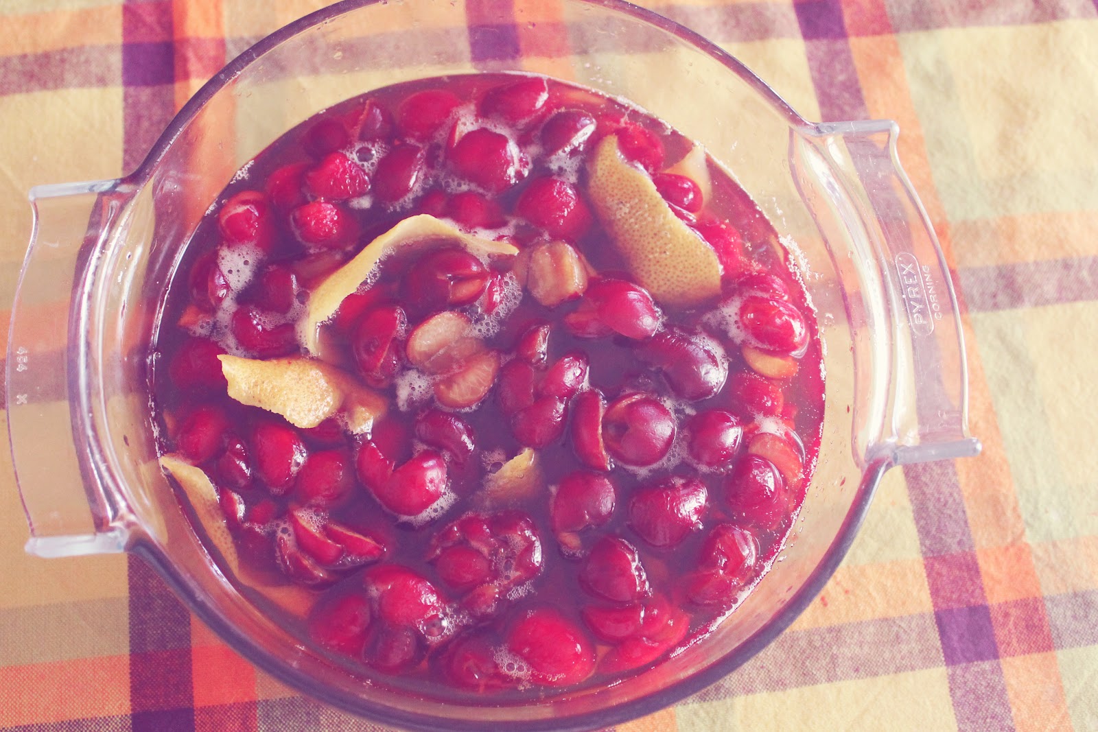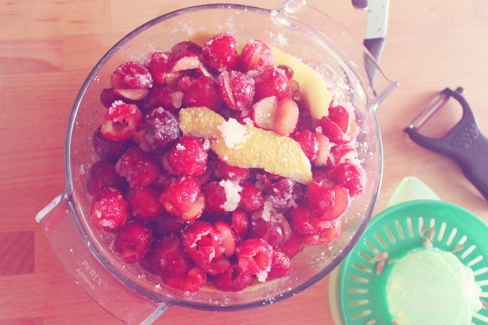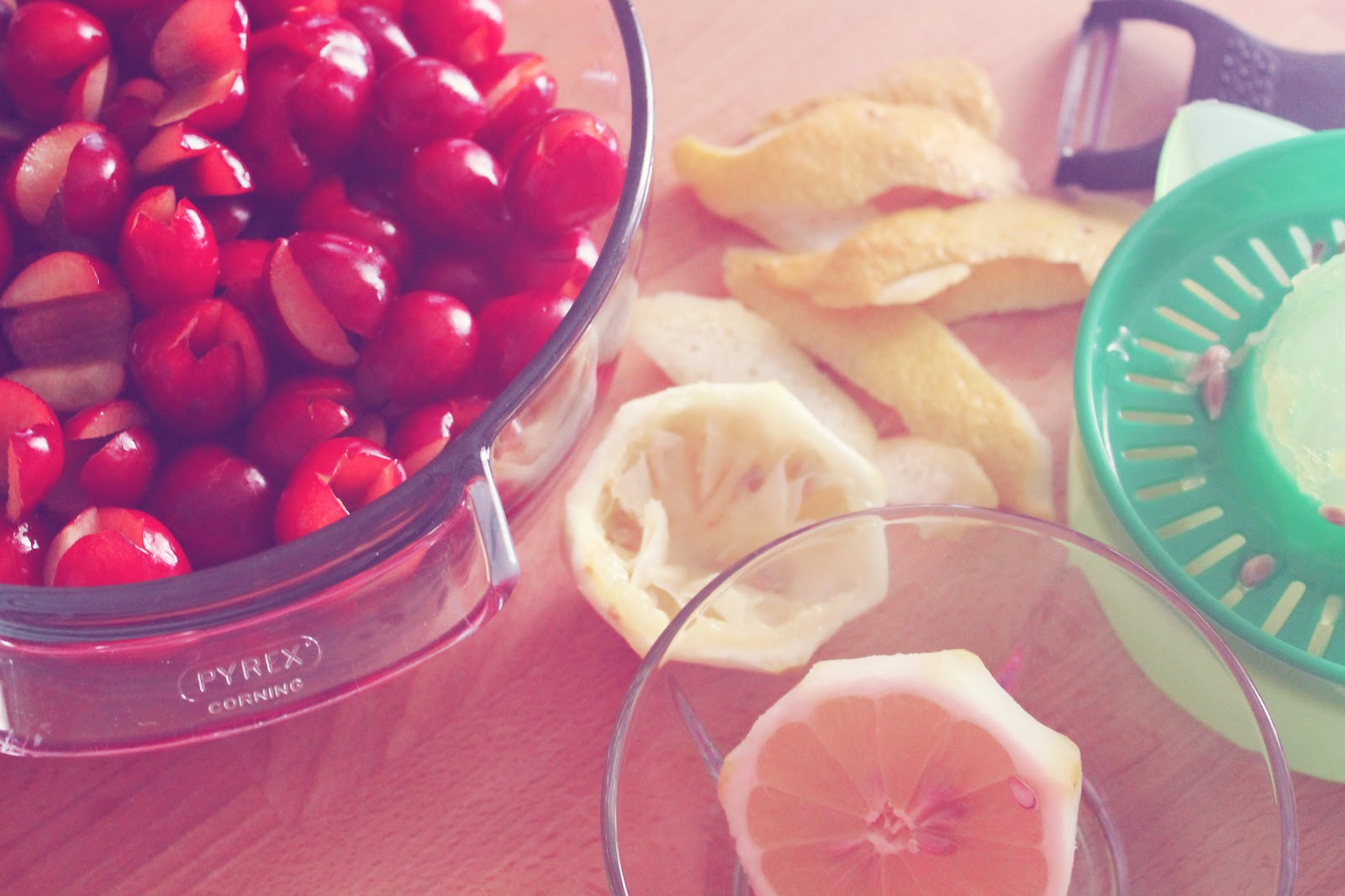 è normale che l'orto del nonno sia sinergico, che non ci vogliono gli spagnoli per spiegargli come si auto concima la terra, producendo ortaggi. Lui è una vita che lavora così ed è l'unico modo che conosce. è normale che le frutta e la verdura sia bio, che i veleni 1.costano (nota la tirchieria degli anziani) 2. non servono a niente secondo lui. è normale che sia tutto a km0, il massimo dispendio di carburante lo si ha in inverno quanto in campagna proprio non puoi andarci con la bicicletta.Questo è decisamente bello, bellissimo, ma ha i suoi contro. Che a gennaio siamo pieni di broccoli, cavoli e cavolfiori. A febbraio di finocchi e spianaci. A marzo di carciofi e bietole. Giugno è il mese degli asparagi e delle ciliegie. E se i primi dopo averli mangiati in tutte le salse: frittata di asparagi, risotto di asparagi, asparagi in insalata, gratinati e grigliati, per non buttarli via li ho lavati, mondati e congelati. Con le ciliegie resta poco da farci. Dopo l'ennesima torta è arrivato il momento della marmellata.Ingredienti:1kg di ciliegie, 1 limone (ovviamente anche questo bio), 300gr di zucchero.Niente polverine magiche, sarebbe un sacrilegio, stuprare tanta bella frutta, cresciuta al sole e al vento, con composti chimici tipo l'aspartame.1. per prima cosa tocca privare tutte le ciliegie del picciolo e del nocciolo. Con i piccioli si fa in fretta, per i noccioli armatevi di buona pazienza. Io da qualche parte in cucina avevo un denocciolatore per olive, che sarebbe stato l'ideale, ma come al solito quando una cosa serve non la trovi mai, così sono andata di coltello. Ottimo esercizio di meditazione, prendete nota: denocciolare ciliegie libera la mente...