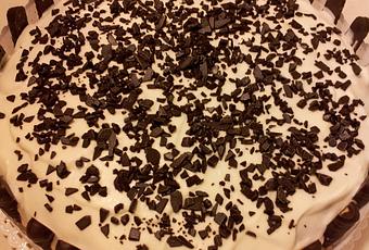 Decorare la parte superiore con le scaglie di cioccolato e decorare il bordo con i biscotti ( se troppo alti, tagliare la base per averli all'altezza del pan di spagna)