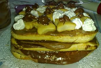 Ho montato una bustina di panna e poi ho farcito così: ogni pezzo di pasta sfoglia è stata spalmata di crema di nocciola, su questa ho messo la crema di caffè e giunta all'ultimo strato ho decorato con biscottini di pasta sfoglia a stellina (ottenuti dagli avanzi) crema caffè e fiocchi di panna. Conservare rigorosamente in frigo!