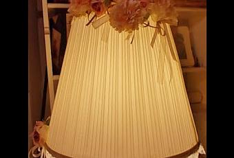 Ho diviso il paralume dal corpo della lampada. Ho dipinto il gambo con uno smalto colore avorio antico. Ho tagliato il paralume, tanto ormai era rotto, l'ho riadatto al porta lampada e ho aggiustato la plissettatura del tessuto. Ho preso dei fiori in tessuto recuperati da bomboniere e confezioni regalo. Cercando in un cassetto ho trovato, abbandonato in un angolino, un merletto di colore avorio, molto romantico e con la colla a caldo l'ho attaccato al bordo alto e a quello basso del paralume. Ho fatto dei fiocchi, ho attaccato i fiori e il paralume è pronto! Se decidete di farlo e non avete dimestichezza con la colla a caldo mi raccomando, fate attenzione, brucia! :D