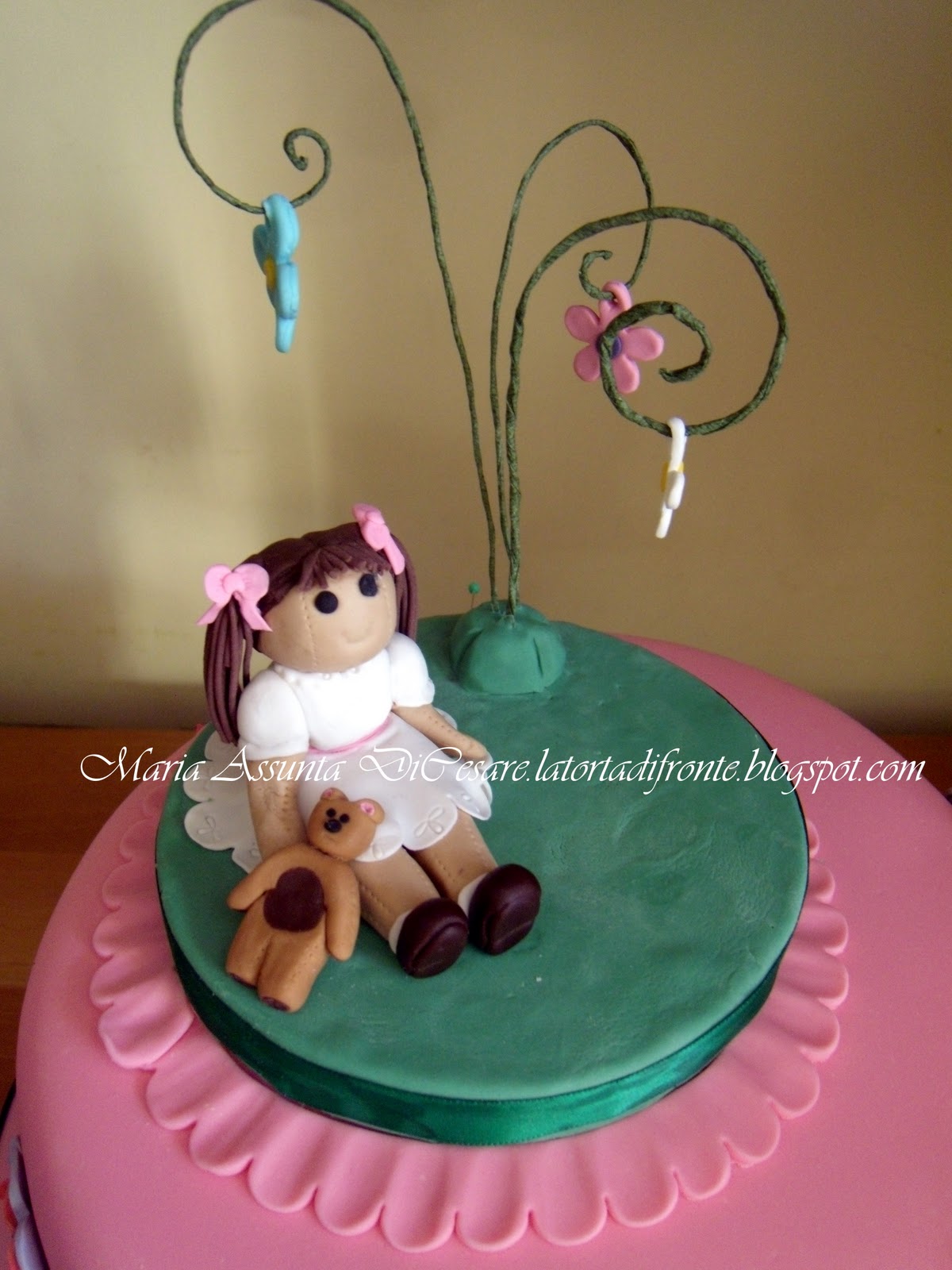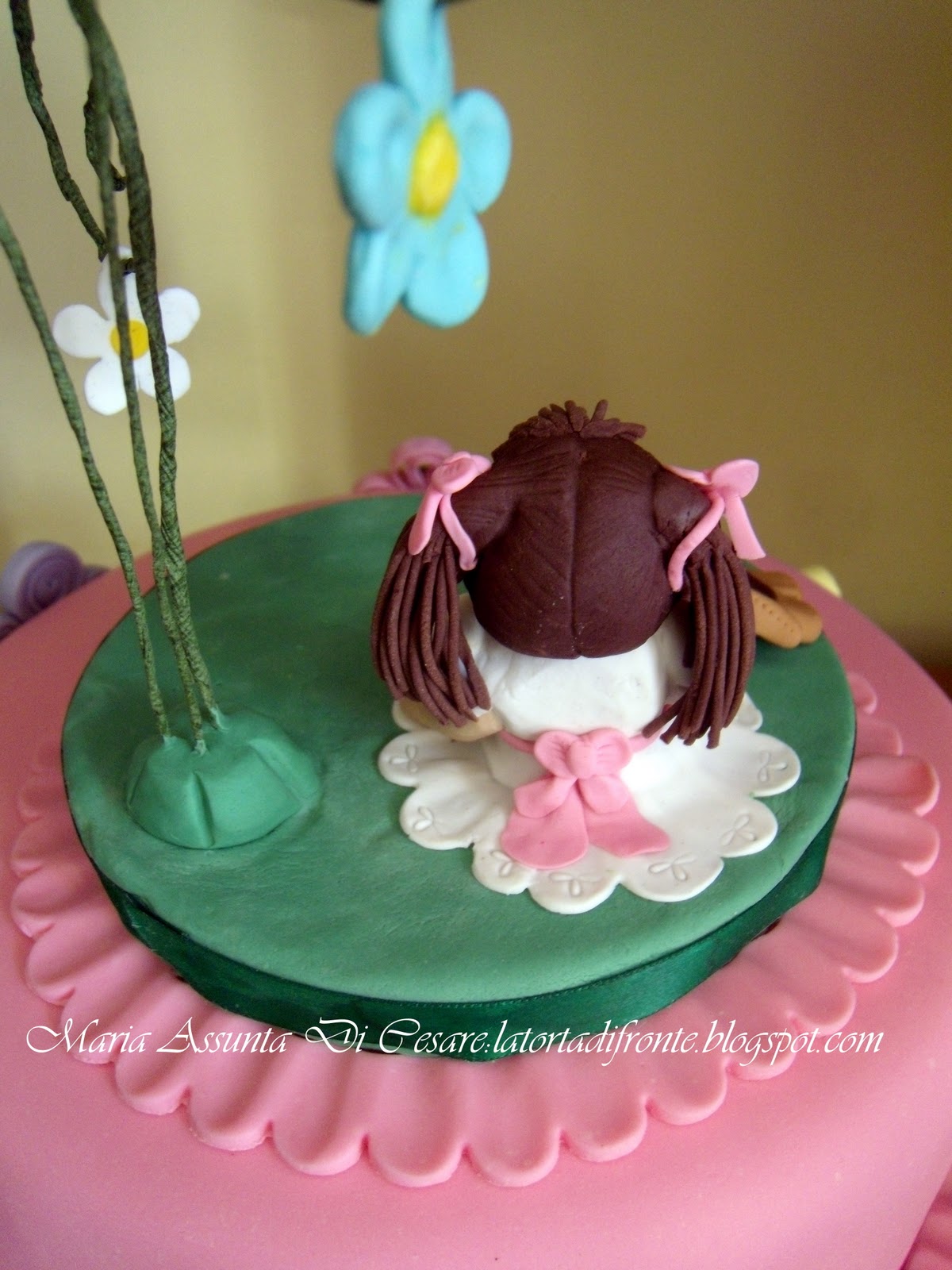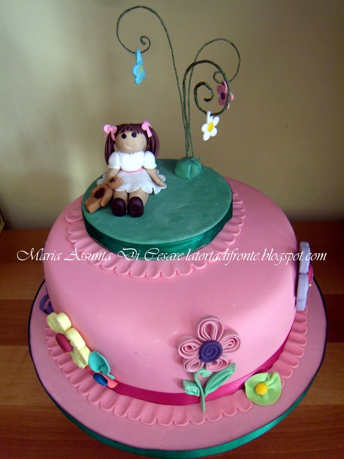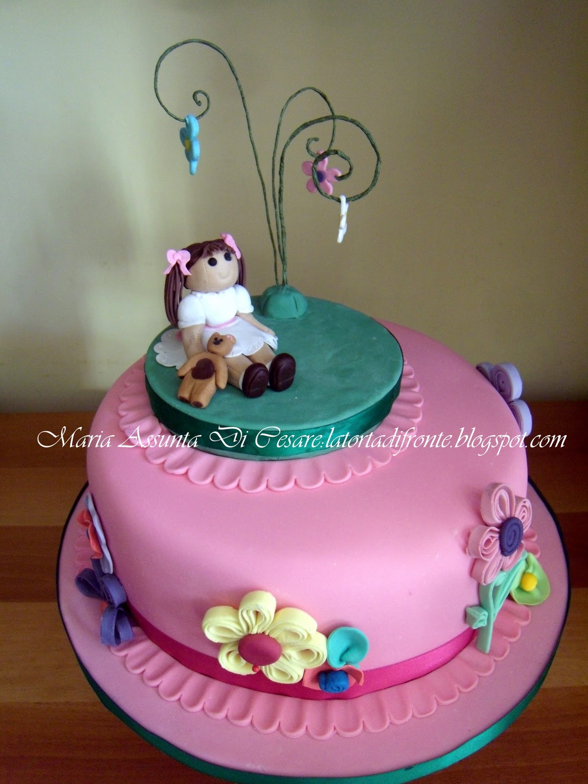 In questo periodo sto lavorando alla tecnica del quilling. Per questa tecnica si usano di solito strisce di carta che vengono ripiegate in vari modi e adattate a varie forme, per costituire le più svariate figure (fiori animaletti, figure geometriche). Utilizzando la pasta di zucchero al posto della carta, ho pensato potesse essere carino formare dei fiori da applicare sulla torta di Giulia.Poi, osservando tra le bambole di mia figlia, ho riscoperto le belle bambole della serie My Doll. Le conoscete ? Sono delle bellissime bambole di stoffa vestite di tutto punto rifinitissime di particolari. Cosi proprio guardando queste bambole che mi è salito il desiderio di realizzarne una in miniatura, ma in pasta di zucchero . Ed allora, dalla teoria alla pratica, ecco quel che ho creato.