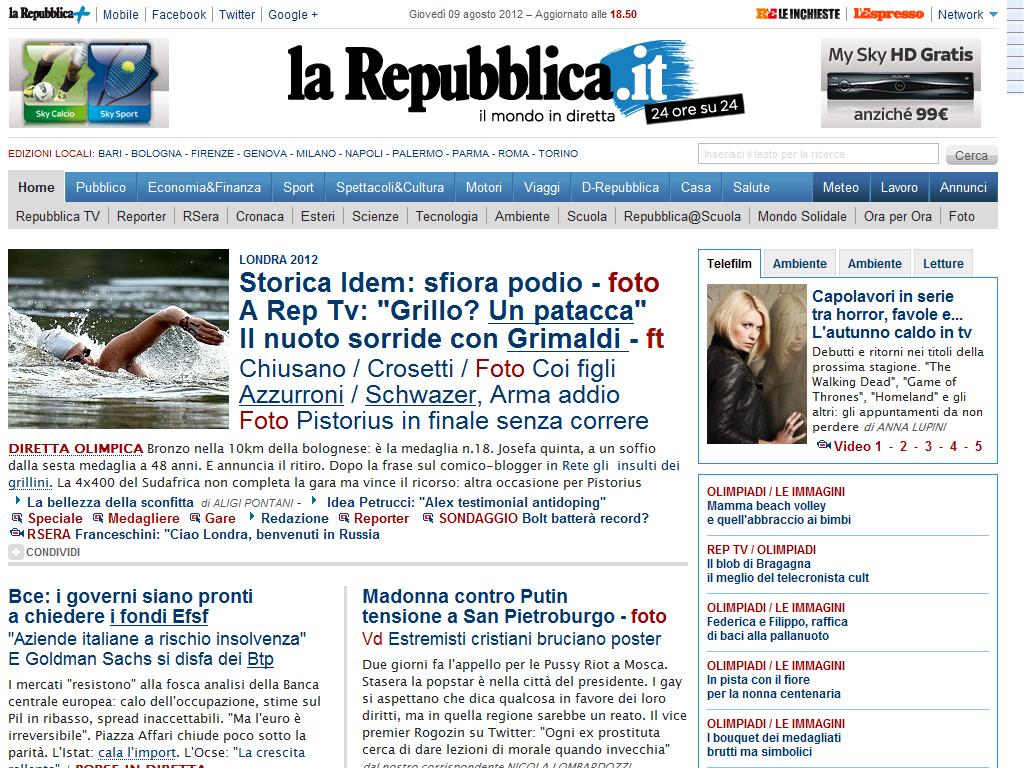 L'home page di Repubblica di ieri pomeriggio, 9 agosto 2012