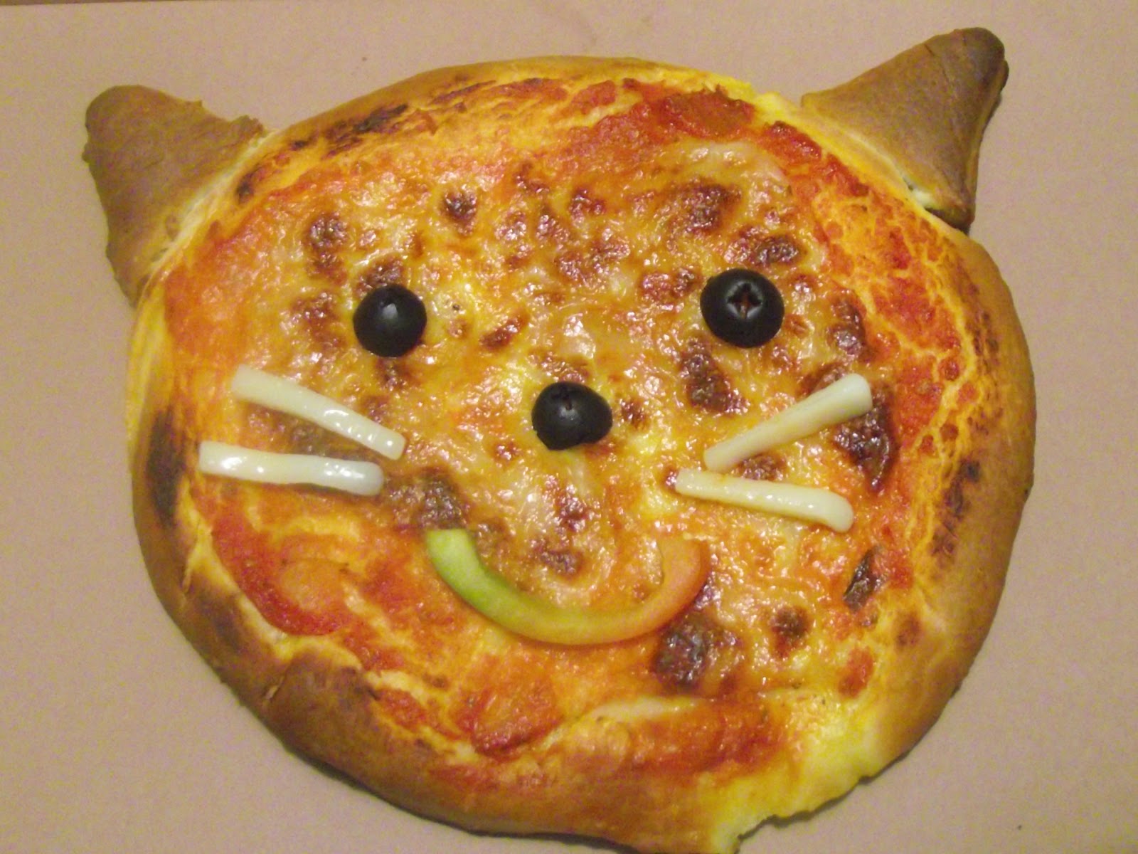 una volta cotta,tiratela fuori dal forno e fate gli occhietti con le olive,la bocca con il peperone e i baffi con l'Emmental.Tutto qui.