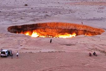 Benvenuti a Derweze in Turkmenistan o - come la chiama la gente del luogo - "La Porta per l'Inferno". A prima vista, potrebbe essere una scena drammatica di un film di fantascienza. Ma questo buco gigante di fuoco nel cuore del deserto del Karakum, non è il risultato di un attacco alieno alla Terra...