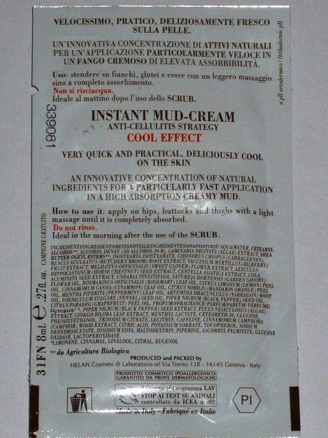 Se qualcuno di voi ha mai utilizzato i classici fanghi anticellulite sa cosa vuol dire spalmarsi addosso quella "roba" verdognola e puzzolente da lasciare in posa per quasi un' ora stando immobili e impacchettate nella pellicola mentre la pelle prende fuoco. Bene, dimenticatevi subito questa brutta esperienza perchè questo fango è diverso. Innanzitutto si presenta sottoforma di crema verdina che non puzza assolutamente avendo un odore di menta misto a dentifricio. Questo fango si massaggia su fianchi, coscie e glutei fino a completo assorbimento. Non si risciacqua e non brucia in quanto, come il gel della stessa linea, genera sulla pelle una piacevole sensazione di freddo. Helan consiglia di applicarlo la mattina dopo un generoso scrub per favorire la penetrazione dei principi attivi contenuti nel prodotto. Concludendo si tratta di un'ottima alternativa ai classici fanghi termali in quanto non richiede tempi di posa, si assorbe come una normale crema e non brucia proprio perchè al contrario è ad effetto freddo e quindi ottimo da utilizzare in estate al posto di una semplice crema idratante.