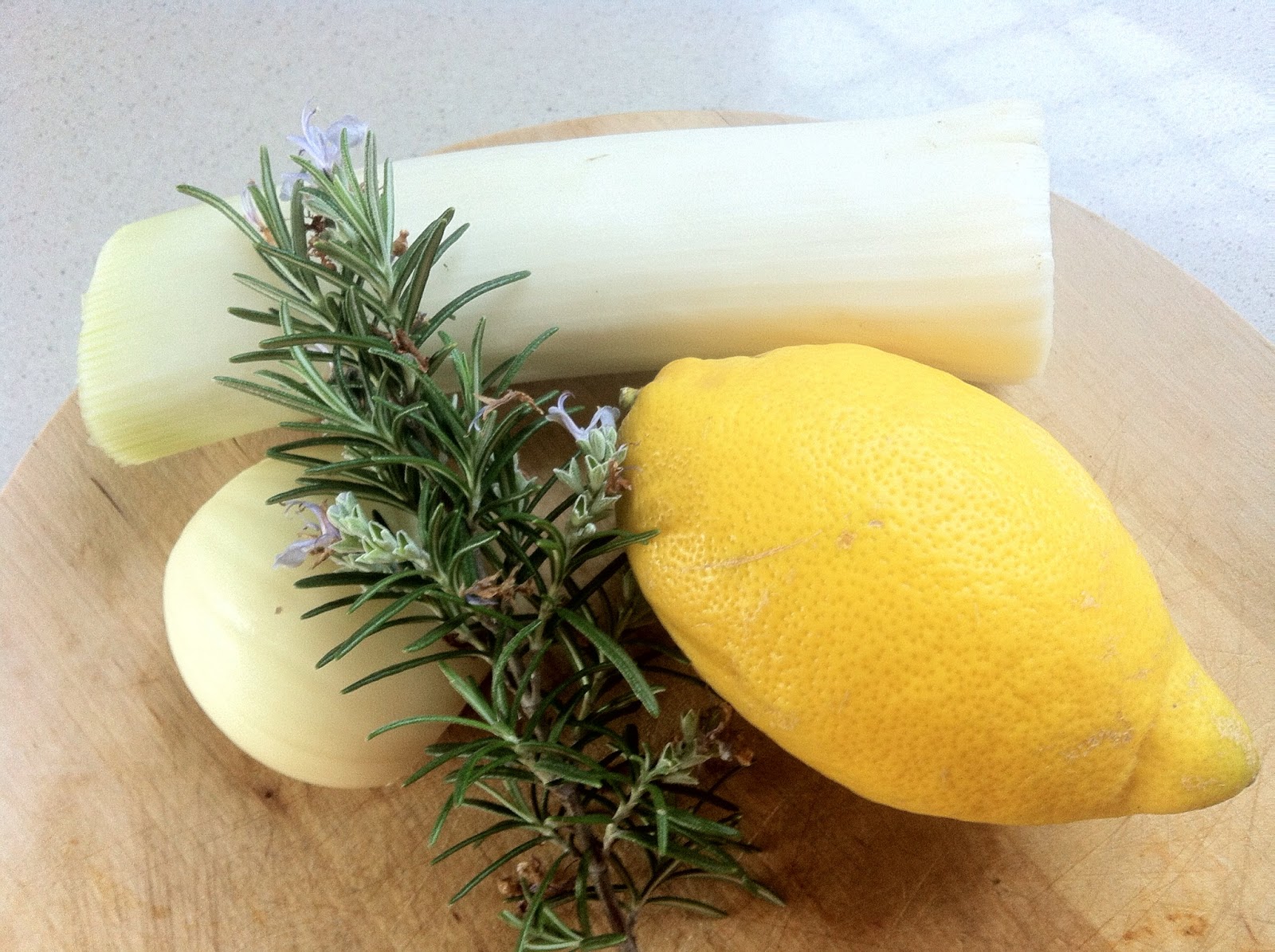 Un ciuffeto di rosmarino fiorito, un limone non trattato, 1/2 porro, 1/2 cipolla, burro q.b., pepe q.b., sale, vino bianco, aceto balsamico q.b., brodo, riso carnaroli a vs scelta.
