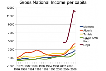 La linea scura è quella della Libia. Ebbene sì, la Libia è decisamente il Paese Nordafricano più ricco. Per intenderci, secondo questo studio attualmente (o meglio fino a una settimana fa…) i libici sono anche più ricchi mediamente di brasiliani, turchi, rumeni, bulgari, serbi, … (non faccio l’elenco ma wikipedia li piazza al 60° posto su 181).