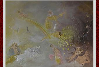 Dino Licci-Apollo-Giove-Aurora-Ipnos.-Notte-acrilico su tela 120X80Tutto si può dire tratte che gli antichi greci mancassero di fantasia e la loro cosmogonia non ha niente da invidiare a quella biblica. Varie sono le leggende in proposito, ma tutte riportano alla paura di Urano prima e Crono poi di essere detronizzati dai loro figli. Urano li uccideva o ne impediva la nascita, Crono li mangiava (la nostra eucaristia ne ricorda vagamente le modalità), mentre il cielo e la terra erano naturalmente visti come nel nostro credo, cioè contrapposti con pari dignità laddove s’ignorava la grandezza dell’Universo e l’insignificante ruolo della terra negli spazi e nei mondi infiniti. Scegliamo, tra le tante versioni, quella che mi sembra più poetica sulla nascita del mondo: Urano che alcune leggende vogliono prima figlio di Gea, in altre versioni è visto come il suo sposo (il cielo) che soffocava la terra rimanendo così avvinghiato ad essa, da impedire che i suoi figli vedessero la luce. Questa era infatti la sorte toccata ai Giganti ed ai Ciclopi. Ma l’ultimo figlio di Gea, Crono, udite le lamentele della madre, si munì di un falcetto con cui taglio i genitali di Urano quand’egli cercò di giacere con lei. Un urlo spaventoso percorse la terra intera mentre le gocce di sangue cadute da Urano ferito generarono le Erinni, i Giganti e le Ninfe e, nel mare, la dea Afrodite. Ma soprattutto si trasformarono in muschi, erbe e licheni e poi ancora in fiori, alberi e piante d’ogni colore e le sue lacrime dettero origine ai mari e fiumi e laghi d’ogni dimensione e furono i pesci e molteplici animali, mentre al sua voce, trasportata dal vento, regalava le idee ed i sogni e fantastiche chimere e fantasie e illusioni.Così Crono cominciò a regnare al posto di Urano ma, avendo saputo che sarebbe stato ucciso da uno dei suoi figli, cominciò a divorarli mano a mano che nascevano. Perciò sua moglie Rea, con l’aiuto di Gea, riuscì a sostituire il figlio Zeus con una pietra e proprio quest’ultimo diventò il capo degli dei dopo essere stato allevato in gran segreto dalle ninfe e nutrito dal latte della capra Amaltea. Sconfitto Crono, Zeus riuscì a fargli rigurgitare gli altri figli per mezzo di un emetico fornitogli dalla moglie, l’oceanide Meti e regnò dall’alto dell’Olimpo insieme con gli altri dei fra cui ricordiamo: Apollo, il dio della luce, Ares, il dio della guerra, Poseidone, il dio del mare, Ermes, il messaggero degli dei, Dioniso, il dio del piacere, Efesto, il signore del fuoco e poi Atena, la dea della saggezza, Afrodite, la dea dell’amore, Artemide, la dea della caccia e Demetra, la dea delle messi. Come si vede, il politeismo greco concepiva gli dei come figure umane tendenti alla perfezione. Essi erano potentissimi senza essere onnipotenti, immortali e dotati di un carattere psicologico individuale e rappresentavano la proiezione divina dell’intera gamma delle situazioni e passioni e sentimenti dell’umanità. La religione greca non si basava su alcuna rivelazione sacra, non esisteva una Chiesa con poteri universali e non esisteva un clero ufficiale. La religione greca non era statica ma dinamica e duttile essendo priva di dogmi ed aperta a qualsiasi contributo che i poeti e gli artisti vi volessero apportare nonché alle discussioni ed argomentazioni varie di filosofi ed uomini di cultura.