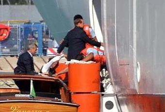 Volto spettrale, sorriso stampato più del solito (un marchio), andamento finto-agile, con body-guard che lo sorreggono con braccia nerborute; qualcosa che ricorda le apparizioni pubbliche di Breznev (o del suo cadavere “fresco di giornata”) nella piazza Rossa. Per farlo salire sulla motonave MSC “Divina” un primo energumeno lo sorreggeva da dietro, un secondo di lato, il terzo, collocato raso terra, gli sorreggeva il prezioso “cavallo”…non si sa mai (v. foto all.)