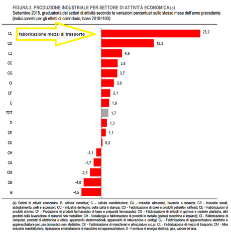 Prendendo gli ultimi dati sulla produzione industriale pubblicati dall'Istat (li trovate qui), possiamo osservare il grafico che segue, dal quale emerge il rilevante contributo apportato dalla fabbricazione di mezzi di trasporto, per via della ripresa dell'attività di FCA (Fiat Chysler Automobilies)