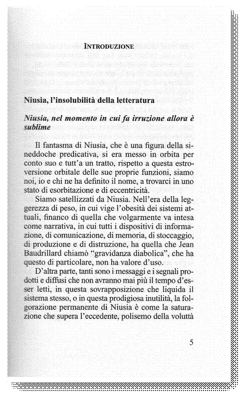 Il senno e l’isola di Niusia Come nella “Tabula Combinatoria” dell’erudito gesuita Athanasius Kircher [Turris Babel, 1679: cfr. “(…) invocare il diritto di primogenitura che al massimo serviva per riconoscerle il primato e candidarla al premio Babel”: I. Apolloni, Niusia, capitolo Sesto, p. 149 prima ed.], la metonimia tra Num e Samech combina il mistero alle idee, la fatalità alle forze, fors’anche il Becco di Mendes all’Angelo della Temperanza, tra la transeconomia politica, la transgeografia delle stagioni della vita. L’evoluzione dell’alfabeto ebraico ha all’origine per Num il segno > e per Samech il segno ں, che ha qualcosa della “Tamahacan” di Ura Rumis, ovvero del “cugno”, finito dentro il nostro testo per Lucia Castagna, il punzone dell’oggetto a, la sua essenzialità orale, la transeconomia della parola, la transpolitica dell’irreversibilità, la forza dell’oggetto fatalmente irredento, e non ci è passato per la testa che è allora per Samech che abbiamo questo “cugno”, essendo la lettera ebraica del “puntello”? C’è, non ci crederete, in questa trasmutazione della scomparsa che è Niusia, che fa passare dentro anche “Nasa”, la “distruzione”, l’“atto di perdersi”, la “morte” di “Num”, che c’è nella parola sanscrita “nása”. D’altra parte, il verbo “nas”, da “raggiungere”, “trovare”, “incontrarsi con”, arriva a “nasyati”, che è “sparire”, “essere perduto”, “correre via”. Sempre per via del naso, di cui al “tamahacan” di Ruma Onux, che è “nas”, senza dimenticare che “niyuj” è lo schema verbale di “legare”, “unire”, “aggiogare”, e che “nyuna” è l’archetipo attributo del “diminuito”, del “difettivo”, che fa da supporto nell’ombra del (-φ) del punzone del desiderio. Va da sé che, in greco, l’enclitica νυν, “dunque” o, come avverbio, per “proprio ora”, nella “notte” , νυχ, o “il pungere” νυξις di Niusia, che sta dentro il “senno” νους, o ci gira attorno, con la malattia, νοσ, questa giovinezza, νέος , eterotopica, un’“isola”, νησιω, che ora è “artiglio”, “unghia”, ονυξ, ora è “asino, asina”, ονος; e se fosse stata solo νεοσσίς, “pollastrella”? V.S.Gaudio ░ èNIUSIA, L’INSOLUBILITÀ DELLA LETTERATURA, introduzione alla 2^ edizione di Ignazio Apolloni, Niusia, Fondazione Apolloni-Fabra/Arianna Edizioni Palermo 2012¨