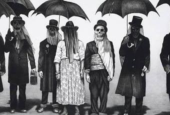 Ho deciso di rimanere in tema morte & affini, negli ultimi post, tema che credo di poter coronare mostrandovi i lavori dell’artista Laurie Lipton, nei quali scene apparentemente normali si rivelano in realtà ben più macabre: anziché visi in carne ed ossa ciò che rimane dei personaggi ritratti dalla Lipton sono unicamente le ossa, quindi via libera a teschi malvagi ed inquietanti personaggi abbigliati in maniera elegante.
