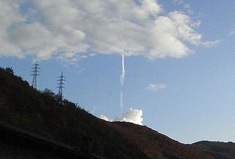 È soltanto una scia di condensazione di un aereo, resa apparentemente verticale dalla prospettiva. Nell’ultima foto, gli oggetti sfocati semicircolari sono dello sporco che si è infilato nella fotocamera e non riesco a levare. L’illusione è resa ancora più forte dalla nuvola che sembra stare alla base della scia, proprio come lo sbuffo che si forma intorno alla rampa di lancio durante la partenza di un razzo.