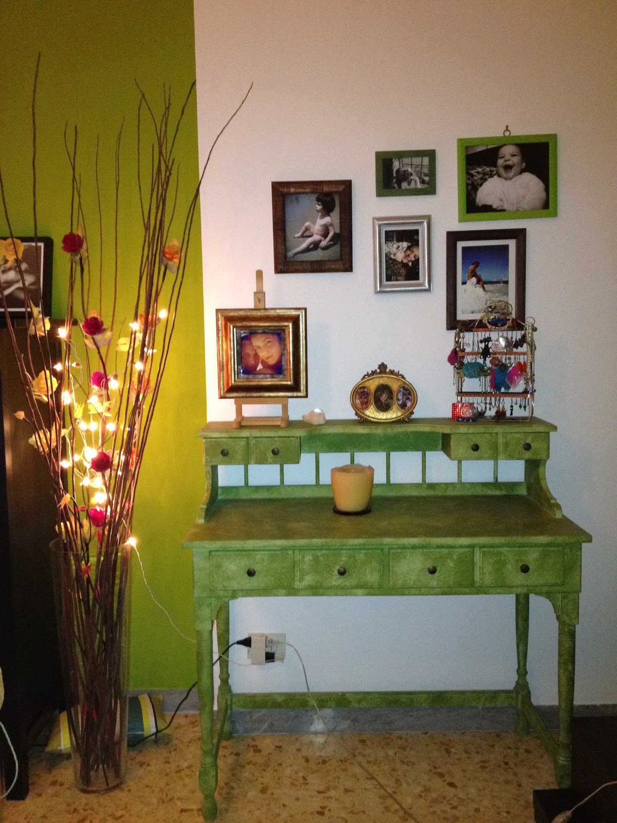Questo è l'angolo..."beauty e ricordi"! Questo scrittoio trovato ai secchioni dell'immondizia qualche anno fa,ora funge da toletta per il trucco. Comodissimi i cassettini nei quali riporre tutto(lontano dalle manine curiose dei mie bimbi!).E pian pianino voglio riempire la parete con le nostre foto più belle!