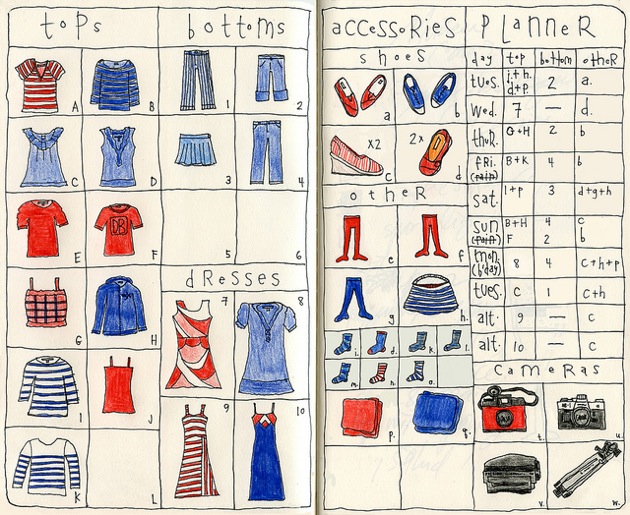 Evito anche di portare diversi cambi, preferendo lavare qualcosa in albergo o affidarlo alla loro lavanderia, o ragionando in economia utilizzare le internazionalissime lavanderie a gettoni: ma in questo caso si parla di viaggi a lungo termine.Per essere sicuri che quello che avete non è superfluo o comunque interscambiabile potreste utilizzare il metodo raffigurato in foto, in cui una signora, un'entomologa, "cataloga" il contenuto del suo bagaglio e poi ne ricava uno schema con gli abbinamenti; se siete però più pazzi di lei, potreste utilizzare delle foto anziché disegni...Qualche sacchetto di plastica: