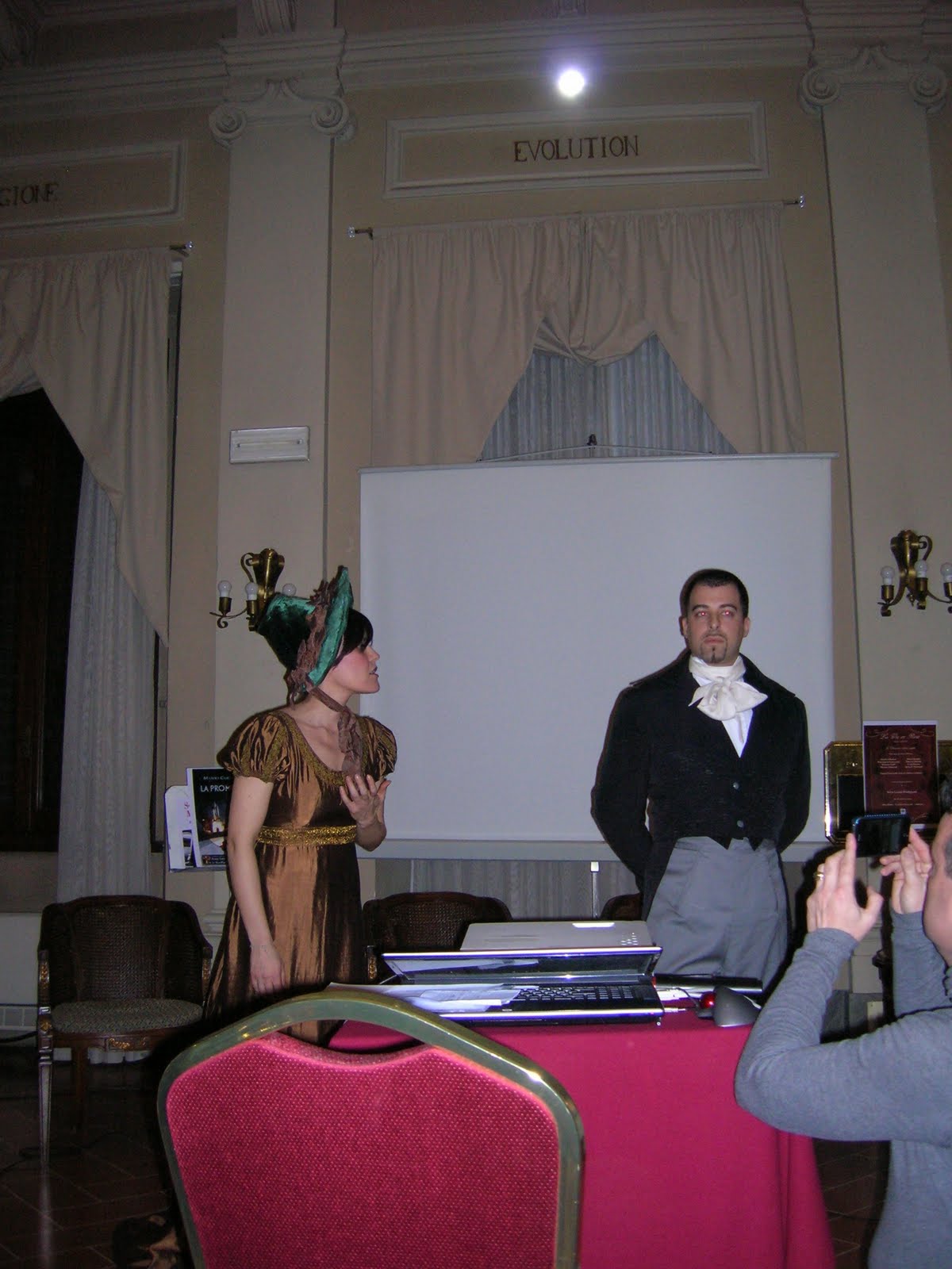 Dopo questa notizia devo ammettere che mi sono un po’ distratta e mi sono messa a chiacchierare con Nuvolina di Romanticamente Fantasy di libri e di bei protagonisti maschili. Ma nonostante le nostre divagazioni, lo show è andato avanti con una videointervista a Edith Gonzales, protagonista di Cuore selvaggio. Dopo il coffee break, sono entrati in scena, è proprio il caso di dire, due attori in costume, che hanno recitato la scena della dichiarazione d’amore che Darcy fa a Elizabeth ma che non va a buon fine. Mi duole dover dire che dopo me ne sono dovuta andare, perché la sera avevo una partita, quindi il mio resoconto finisce qui. Per vedere cosa è successo dopo, vi rimando al blog La Mia Biblioteca Romantica. Le foto che ho inserito, sono poche e non bellissime... anche per quelle, vi rimando a Vivienne.