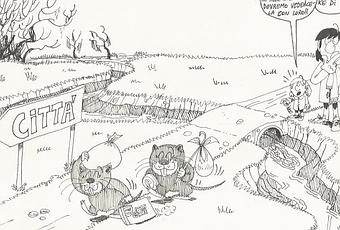 Da qui la nuova vignetta che mostra ancora una volta i nostri amici che avevamo conosciuto nella vicenda di via Milazzo: il padre riflessivo e osservatore con il figlio sempre pronto ad esporre le proprie considerazioni; mentre le due nutrie, con i loro fagotti stanno trasferendosi in città dove sperano di trovare almeno un po' più di acqua...