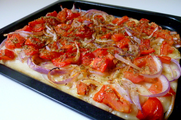 Mentre lievita, mescoliamo dei filetti di cipolla rossa (io li ho lasciati in ammollo in acqua fredda salata per un’ora) e dadini di pomodoro.Spargiamo sulla pasta le verdure, un’abbondante dose di origano, saliamo, diamo una macinata di pepe, e finiamo con una tazzina da caffè o anche un po’ di più di olio extra vergine di oliva.Inforniamo a 180 gradi per circa mezz’ora.Nota: la mia dispensa di ricette dell'isola non riporta l'origano. Ce l'ho messo io facendo di testa mia. E la prossima volta ci metto pure le acciughe.