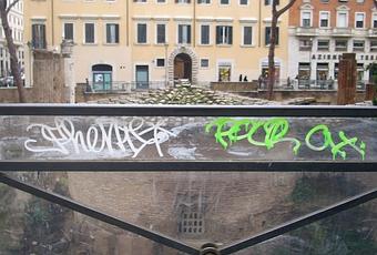 "Tu quoque, Brute, fili mi?". Siamo nell'Area Sacra di Largo Argentina, e questi sono i resti dell'Area Sacra, il luogo in cui, con tutta probabilità, nel 44 d.C. si consumò l'agguato mortale a Giulio Cesare. Sorvoliamo sullo stato deprimente di conservazione dell'area, sulla sua mancata valorizzazione e sulla modestia infinita dell'arredo urbano. La cosa che però non possiamo proprio tollerare è che questa zona venga quotidianamente presa d'assalto da un'orda di deficienti con la bomboletta, nell'indifferenza generale, senza che nessuno si curi di tutelarla o di proteggerla, o quantomeno di ripulirla con una certa costanza.