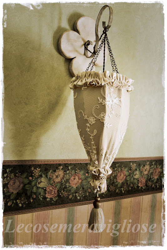 La luce diffusa da questa lampada handmade country chic è veramente splendida,persino le ortensie essiccate sembrano rinate!