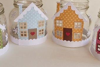 Questa fustella è stata una degli ultimi acquisti, e devo dire che sono riuscita a creare parecchie cosine, che vi mostrerò più avanti.Queste sono delle piccole lanternine realizzate con dei vasetti di vetro (marmellata), decorati con una casetta fustellata e tanti fiocchetti di neve.