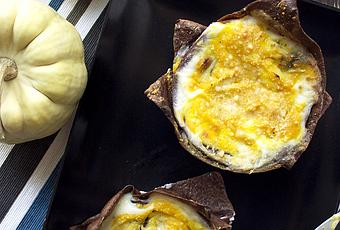 - Sistemare i due fogli quadrati in modo da lasciare le punte leggermente oltre i bordi delle formine cercando soprattutto di ricoprire perfettamente tutto il bordo delle stesse. Tra un foglio e l'altro mettere della besciamella in modo che non ci siano parti di sfoglia che si tocchino senza avere nel mezzo della besciamella. Mettere un goccio di besciamella anche sulla base e sistemare come primo strato un po' di spinaci dai quali si sarà eliminato lo spicchio di aglio. Coprire con uno strato generoso di gorgonzola dolce. Procedere poi alternando uno strato di sfoglia rotondo, un po' di spinaci, della besciamella, della crema di zucca, uno strato di lasagna, uno di besciamella, uno di crema di zucca, un ultimo di lasagna per concludere con un generoso mix tra besciamella e crema di zucca. Cospargere con un velo di parmigiano grattugiato, infornare e cuocere per circa 20' a 180°.