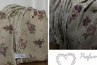 Un pò misti: di stoffa di lino grezzo con timbro, di stoffa di lino e cotone con rose con le tonalità dl lilla (stoffa meravigliosa che mi era stata regalata da Silvia) e poi stoffina di cotone inglese con rose...tutto riempito con fiori essiccati di lavanda.Ho applicato un occhiello per poterci passare uno spago di cotone in modo da poterli usare sia come profuma cassetti, sia appesi ad un armadio, alla maniglia di una porta oppure anche in auto.