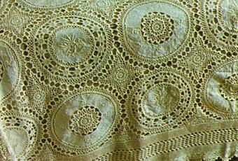 Un copriletto che è un vero capolavoro. Motivi all'uncinetto si uniscono con la stoffa e creano splendidi rosoni. Completamente in stile Vintage.