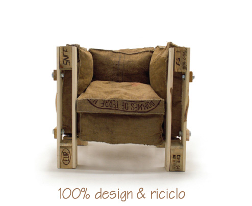 Il design è fedele alla versione originale mentre i materiali sono tutti rigorosamente riciclati: struttura realizzata attraverso il recupero di vecchi pallet e sacchi di juta per seduta e schienale.