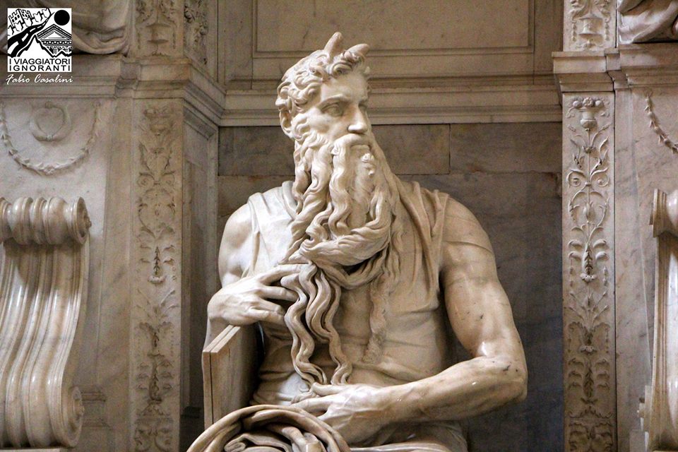 Ora gli affreschi assumono una visione chiara nella nostra mente.L’angelo che indica la strada.Il sonno dei soldati.La luce che illumina il percorso di Pietro.Abbiamo l’animo in pace per aver compreso le figure che, dall’alto, scrutano il nostro camminare all’interno del luogo sacro.Siamo pronti per l’eterna bellezza?Volgiamo lo sguardo a destra.Una figura attira a se, attrae il nostro essere.La statua di Mosè, sublime opera di Michelangelo!L’altezza, 235 cm, incute timore.Lo sguardo, definito terribile, attende il nostro guardare.Il profeta è seduto, con la testa rivolta a sinistra.Il braccio sinistro è abbandonato, il destro sostiene le tavole della Legge.Sul capo due corna.Mi soffermo. Indago. Sono corna.Inizia una tribolata ricerca.Le corna sono, con molta probabilità, un errore di traduzione dal Libro dell’Esodo.Quando Mosè scese dal monte Sinai - le due tavole della Testimonianza si trovavano nelle mani di Mosè mentre egli scendeva dal monte - non sapeva che la pelle del suo viso era diventata raggiante, poiché aveva conversato con lui. Ma Aronne e tutti gli Israeliti, vedendo che la pelle del suo viso era raggiante, ebbero timore di avvicinarsi a lui.[4]Il problema risiede in quelle parole: mentre scendeva dal monte aveva il viso raggiante. In ebraico “karnan”, raggio, potrebbe essere stato confuso con “keren”, corna.La spiegazione regge?Preferisco indagare. Esco da san Pietro in Vincoli con la ferma convinzione di dover sondare terreni diversi.