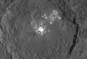 Con una dettagliatissima immagine del cratere Occator, la sonda Dawn della NASA ci mostra come mai prima d’ora alcune delle enigmatiche macchie brillanti che punteggiano la superficie del pianeta nano Cerere. La foto ha una risoluzione di 140 metri per pixel ed è stata ottenuta combinando due differenti riprese – una esposta correttamente per le zone brillanti, l’altra per le aree circostanti, più scure – proprio per compensare le profonde differenze di luminosità dell’area osservata. L’analisi dell’immagine ha permesso agli scienziati di rilevare che il bordo del cratere Occator, in alcuni tratti, risulta quasi verticale, con pareti dal dislivello di quasi due chilometri.