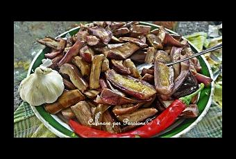 Ingredienti: 2 kg. di melanzane piccole, 6 bicchieri d’acqua, 5 bicchieri di aceto, 5 bicchieri di vino bianco secco, 2 manciate di sale, olio di semi di girasole, aglio, peperoncino olio extravergine d’oliva.