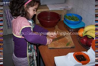 Ho cominciato col far tagliare le verdure alla mia aiutante folletta, come la chiamo sempre io, ovviamente sotto stretta supervisione ... notare il grembiulino handmade.