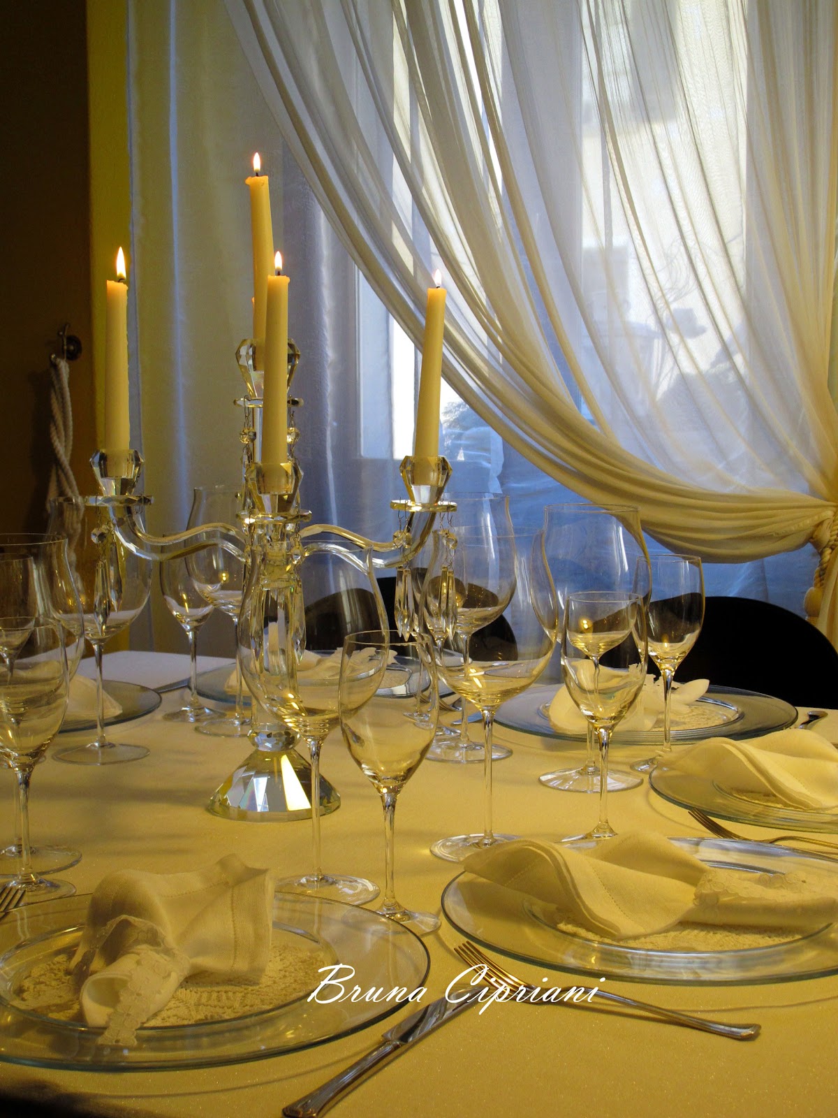Ho ripescato dalla cantina dei sottopiatti in cristallo trasparente che avevo comperato anni fa e mai usato, ed ho pensato di giocare sulle trasparenze del vetro e dei pizzi...
