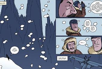 Il tutto in un paesaggio irreale, un immenso deserto bianco all'apparenza quieto, che però nasconde segreti talmente opprimenti, da provocare la pazzia nella mente di chi è destinato a scoprirli. Ed inevitabilmente, alla follia e alla tragedia conduce la scoperta delle bellissime e inquietanti “montagne della follia” che danno origine al nome della storia, una catena montuosa alta come nessun altra al mondo, dietro la quale si cela un mondo proibito agli umani, un mondo fatto di immmensi costrutti alieni che rivelerà loro ciò che siamo realmente, ossia dei piccoli esseri che si affannano a sopravvivere in un mondo che ospita altre forme di vita oltre la nostra, forme di vita che sembrano demoni dell'inferno pronte a divorare tutta la fragile civiltà umana. Il tratto di Culbert è essenziale e l'uso dei colori rimanda il lettore nella dimensione di indeterminatezza e paura che pervade i membri della spedizione man mano che si addentrano nella scoperta di un mondo estraneo fatto di architetture e simboli alieni, di città sconosciute sul fondo dell'oceano e di enormi pinguini senza occhi che sembrano essere i depositari di un