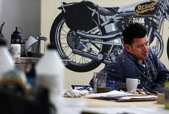 Giovane ed inglese ( è nato nel ’65 a Canterbury) formatosi presso il Ravensbourne College of Art and Design e poi presso il Middlesex Polytechnic , Conrad Leach ha assorbito durante i 15 anni trascorsi lavorando per colossi industriali nel campo del fashion come nel caso del gruppo LVMH Moët Hennessy • Louis Vuitton S.A., tutto il valore e lo spessore delle icone contemporanee che ci ripropone nelle sue tele. Uomo di moto, oltre a dipingerle ha progettato e costruito una special denominata BS1 derivata da una H.D. Sportster del 1986. Conrad Leach nel suo studio in uno scatto di N.Mykel