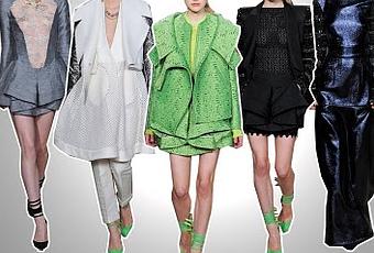La giacca è completamente destrutturata, si apre sul davanti in un macro collo affilato e conserva elementi di feltro traforato sulle maniche o sul davanti, inoltre sembra essere come poggiata su un'anima interna, una seconda giacca che amplifica la grande stratificazione che caratterizza ogni outfit. La gonna ha origami sinuosi sul davanti e sul di dietro, una sorta di bavero oscillante sotto la falcata: sa di spugna di mare e di corallo. Con lo scorrere degli outfit l'architettura diventa decoro: la collezione è un cantiere aperto dove la struttura si lega perfettamente all'abbelimento, ad un accomodamento che trova pace nel pizzo stagnante sul seno, una finestra disegnata tutto intorno con brani di tessuto lamé verde ramarro e rosso ruggine brillante. Il pantalone sottile, aderente, incornicia uno stiletto a punta dal colore acceso e con multi cinturini firmato Manolo. Deliziosa, ha elementi che ricordano Pucci by Dundas e Scognamiglio rimanendo comunque personali e singolari. Una collezione altamente desiderabile: un 10.