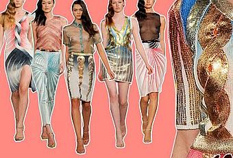 Ed anche Marco De Vincenzo, dopo una serie gravidanze extrauterine, partorisce la sua meraviglia. I marmi di Olympia e l'antica Grecia non erano mai stati così affascinanti: ora la dea greca può smettere pepli ed armature e dedicarsi interamente al recupero di questa meravigliosa collezione. Si apre con un mini completo di pelle bianca micro pieghettata, un accorgimento semplice ed efficace che riprende il motivo di una parete consumata trattata a calce, per poi giungere a tutta una serie di soluzioni di maglia colorata: motivi sinuosi, intrecciati, regalano alla collezione e all'ispirazione iniziale un senso nuovo, eterno. Una misura intelligente dove l'ispirazione, che spesso conduce a qualcosa di banale, serve come pretesto per creare un alfabeto nuovo, pregno di significati. I movimenti grafici della maglia, dipinta a mano con sfumature che vanno dal celeste al magenta, dal grigio al verde, realizzano una dimensione tridimensionale grazie ad un gioco di cavi e pieni che determinano forti suggestioni chiaroscurali. La modella è una colonna scavata che la sera è bagnata di movimenti ondosi di organze trasparenti e guizzi dorati: la maglia lavorata "a sbalzo" raggiunge un effetto scenico incredibile nell'oro incrostato che riflette le tinte vicine in un baluginare continuo di arcobaleni splendenti. Bellissima. Marco ha finalmente regalato all'Italia il suo piccolo sogno. Un 10.