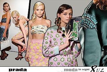 Molto giocosa, con toni pastellati molto caramella, grazie ad un utilzzo di sangallo agrumoso e di stampe cadillac anni 50. Abbattimento della donna convenzionale: Miuccia ricostruisce i canoni del bello della moda inducendo i codici della sensualità verso un'ironia che strizza l'occhio all'arte contemporanea, attraversando un kitsch riletto in chiave moderna, tra il rock ed il punk. Mini top di raso arrocciato e gonne a vita alta, sempre di raso o di pelle colorata, micro pieghettature di chiffon e capispalla squadrati (meravigliosi) sia nella versione decorata con applicazioni floreali, sia nella versione più deluxe con applicazioni di cristalli sulle spalle. Cadillac anche per gli accessori: sulle borse disegni grafici di supercar e le scarpe diventano autovetture con spoiler fiammeggianti (divertenti ma fondamentalmente terribili) sagomati. A tratti ricorda molto la FW 2011.12 di Miu Miu di cui questa collezione sembra sorella. Bella... ma più che un miracolo questa volta Miuccia ha fatto una grazia! Ci rimugino da un pò, mi fa riflettere molto, ma dopo vari ripensamenti... 8 e mezzo!