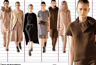 L'essenza del minimalismo modernista in una collezione firmata Ter et Bantine.Colori naturali e pastellati in una palette che vira dal rosa cipria al cammello, dal marrone al nero. La linea, pura, tirata quasi sotto la diligenza di una squadra gemma e si schiude in una corolla romantica di petali ed arricciature, attraverso tutta una serie di curve improvvise che rendono la collezione estremamente poetica . Capo feticcio la mantella: tagliata a crudo, un bisturi disinfettato descrive una linea spezzata, obliqua, o una cicatrice chiusa da bottoni... la cappa cade dalle spalle come una cupola poggiata su un timpano e aperta ai lati mediante fessure chirurgiche lascia intravedere le braccia ripiegate.